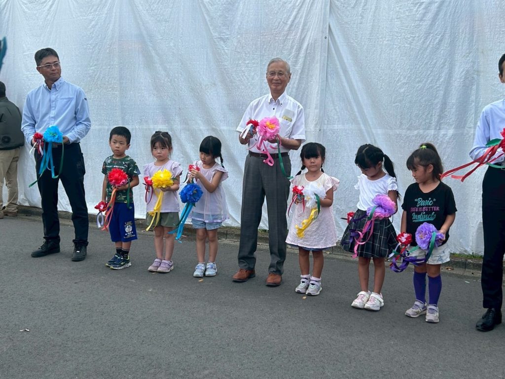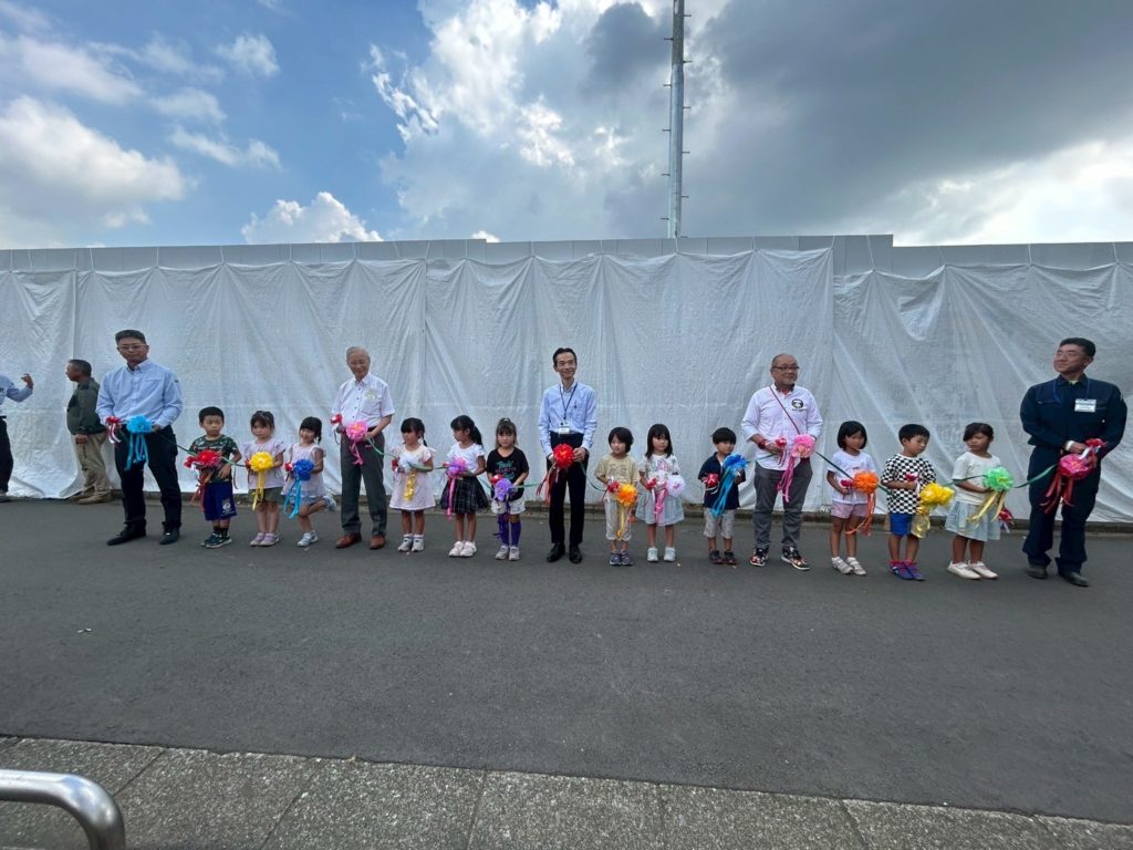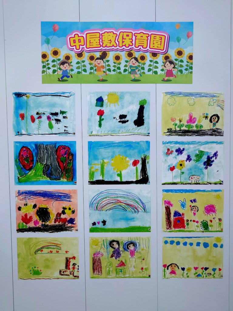9月10日(水)に竹村町公園東側の工事仮囲いに区内19の保育園園児が描いた250枚の絵のお披露目式が行われました。これは瀬谷区のこども家庭支援課が主催し、横浜市脱炭素・GREEN×EXPO推進局と近隣で大門川雨水調整池を建設している戸田・TSUCHIYA・横浜建設共同企業体が協賛して行われたお披露目式でした。1年半後に迫ったグリーンエクスポの機運醸成が目的に行われました。近隣の中屋敷保育園児の前で山岸瀬谷区長と堀野瀬谷北部町内連合会会長のあいさつの後テープカットの後、250枚の絵が現れると一同歓声が上がりました。絵の前の道路は行きどまりのため車の往来は殆どなく絵の鑑賞には最適な場所です。竹村町公園で遊ぶ子どもたちや公園内でのゲートボールなど高齢者にも鑑賞の機会はあるでしょう。式のあった日曜日にはこの公園で夜間竹村町祭りが行われスポットライトで照らし鑑賞者がおりました。皆さんも無機質な白い仮囲いに潤いを与えている絵を一度鑑賞されることをお勧めいたします。