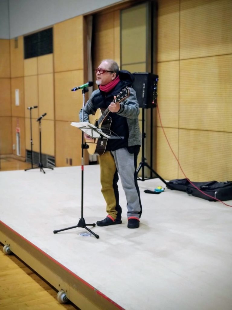 今回の演目は、歌謡漫談のギター演奏、竹村町内会長でもあり、田端義夫氏を師匠に持ちギター演奏をして各養護施設を訪問する活動を長年に渡りしている高田まさき氏をトップバッターにしました。持ち時間は25分~30分でお願いをして演奏はブルーライトヨコハマ(石田あゆみ)・上を向いて歩こう(坂本九)・擦りの歌(なぎら健壱)・民謡発祥のこきこり節(日本最古の民謡)などを紹介しながら、会場の手拍子を交えながら時間いっぱいのひと時を過ごした。