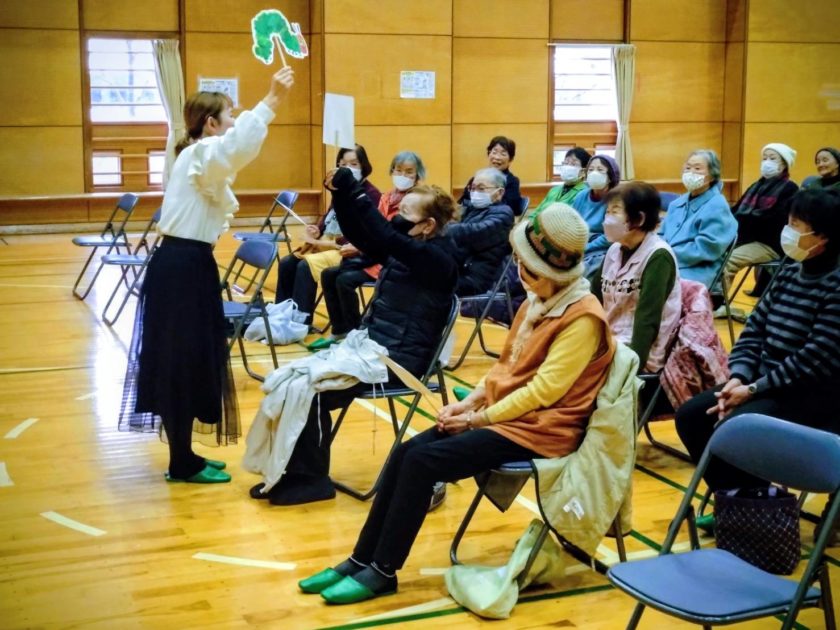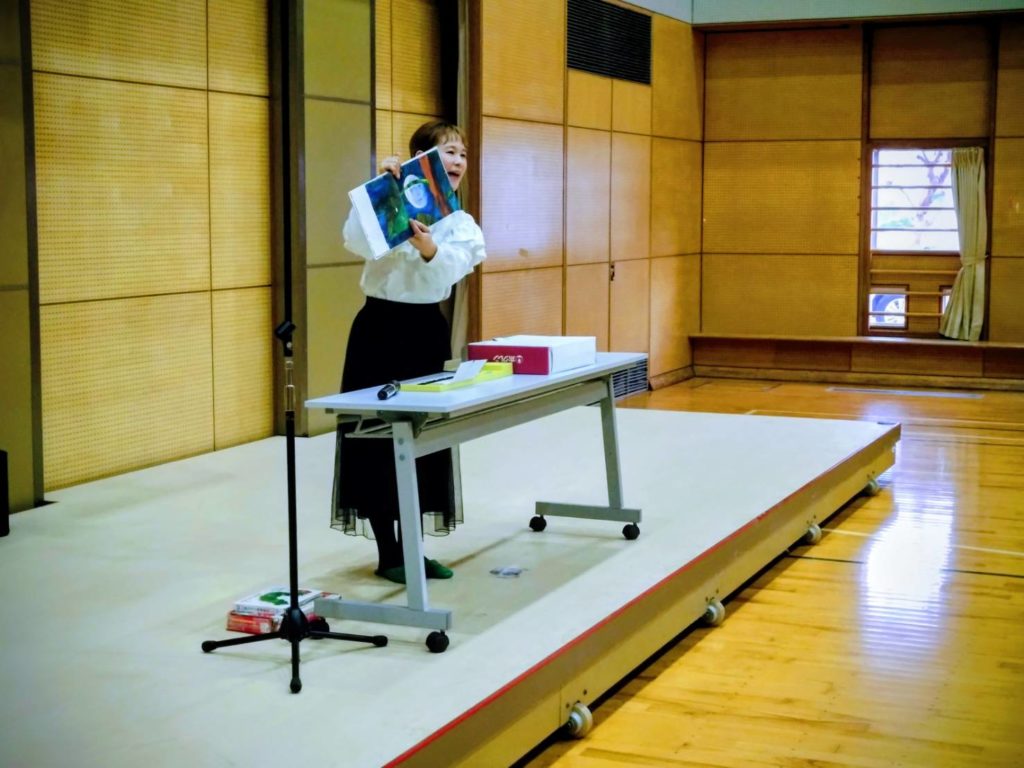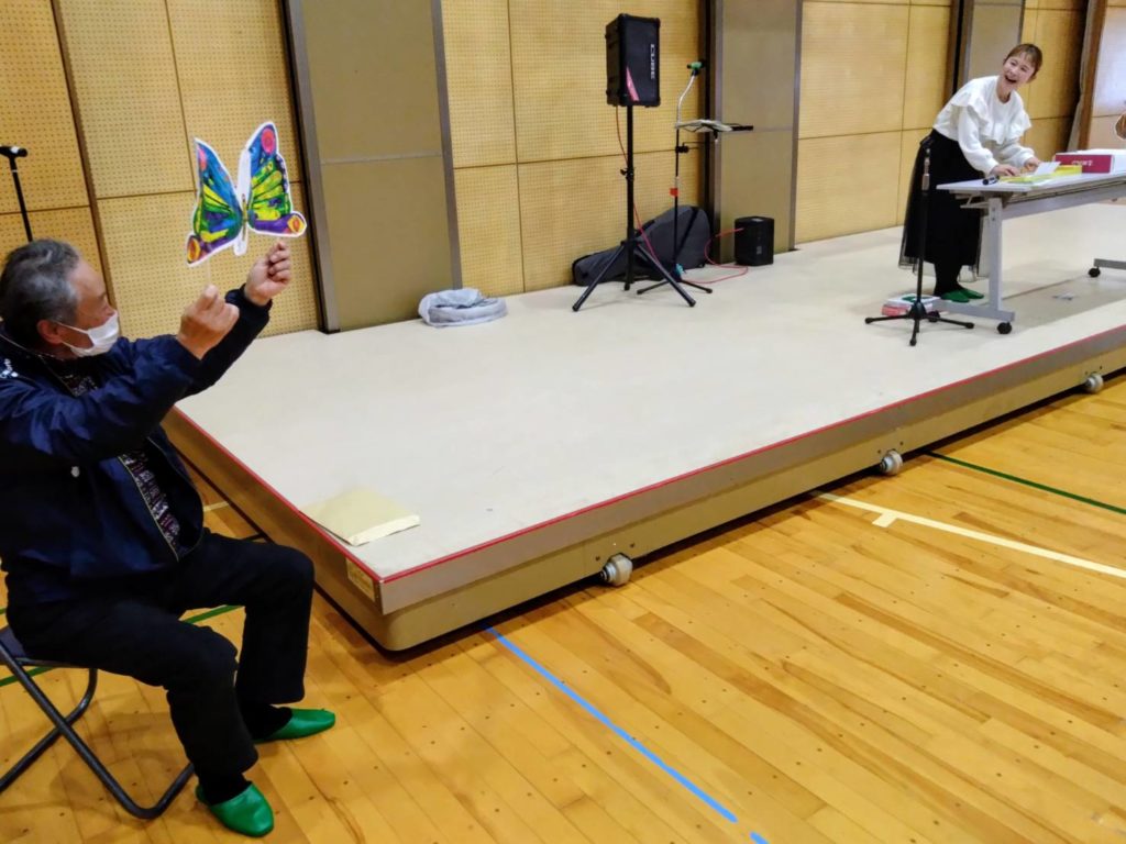 そして次の演目はマークスプリングスの中井桃子さん。歌・ダンスに打ち込み、宝塚歌劇団を目指す。その後劇団四季に入団し活躍された。現在は子どもたちに歌・お話を聞かせる活動をしている。演目は話語り(はらぺこあおむし)を会場の参加者にお手伝いをお願いし、青虫が大きくなるに伴い色々な食べ物を歌いながら会場を廻り、その歌声に心が洗われるような美声の持ち主である。やがてはその青虫はきれいな蝶になる。(会長の遅れが(笑)を誘た。)